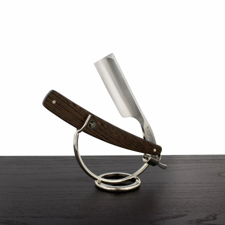 Crafted from high-quality carbon steel, the 6/8-inch blade of the Boker straight razor features a straight spine and a square point, delivering precision and control for a smooth shave. The polished blade boasts a flawless finish, devoid of any etchings, and is ground to an extra hollow grind with a ridge, ensuring optimal sharpness and cutting performance. You have the option to receive the blade either as is or honed by a professional honemeister, providing tailored sharpening to meet your shaving preferences. Complementing the exceptional blade is the handle, meticulously crafted from African Wenge wood, renowned for its rich, dark hue and fine grain pattern, making it both visually striking and enduringly stylish.