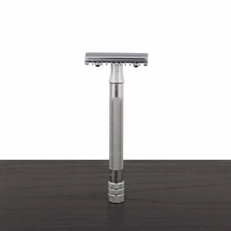 With its longer handle designed to provide superior shaving control and a safety bar featuring open teeth, this razor offers both comfort and safety during grooming routines. Ideal for individuals with larger hands, the 4-inch length ensures a secure grip, facilitating smooth and precise shaving motions. Additionally, as a three-piece chrome razor compatible with double-edge blades, it offers versatility and convenience for wet shaving enthusiasts seeking an elevated grooming experience.
