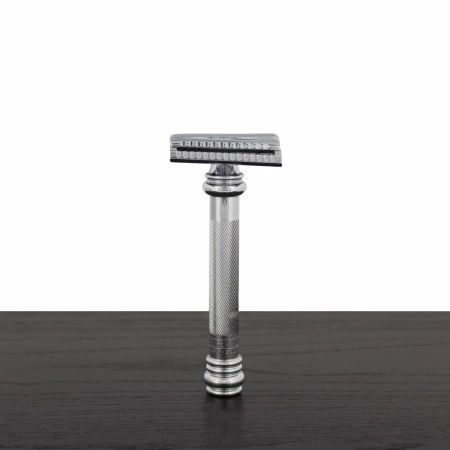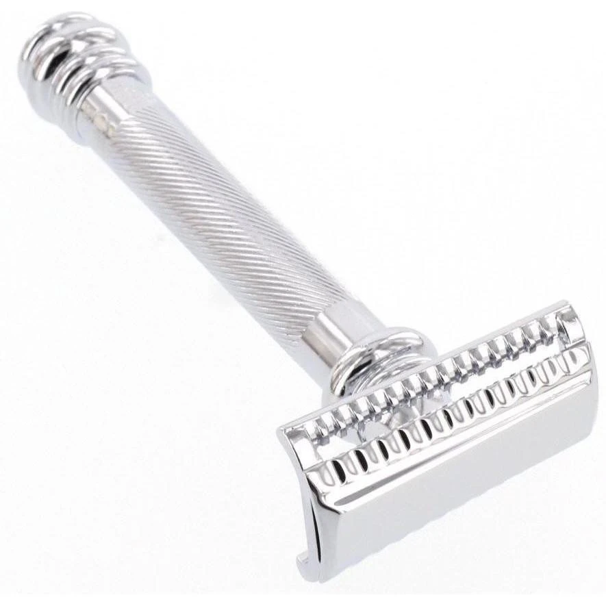 The Merkur Heavy Duty Long Handle Barber Pole Safety Razor offers a premium shaving experience with its chrome-finished 2-piece design and ergonomic handle. With a length of approximately 3.75 inches, the handle is crafted for comfort and features a non-slip grip for added control during shaving. Heavier than the 34C model, weighing over 4 oz, this razor is designed to provide stability and balance for a smooth and precise shave. Utilizing double edge blades, it ensures a close and comfortable shaving experience, making it a popular choice among wet shaving enthusiasts.