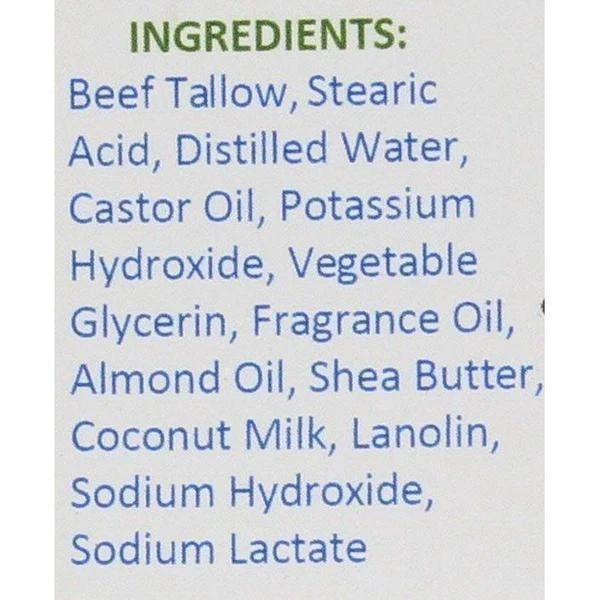 Ingredients: Beef Tallow, Stearic Acid, Distillled Water, Castor Oil, Potassium Hydroxide, Vegetable Glycerin, Fragrance Oil, Almond Oil, Shea Butter, Coconut Milk, Lanolin, Sodium Hydroxide, Sodium Lactate