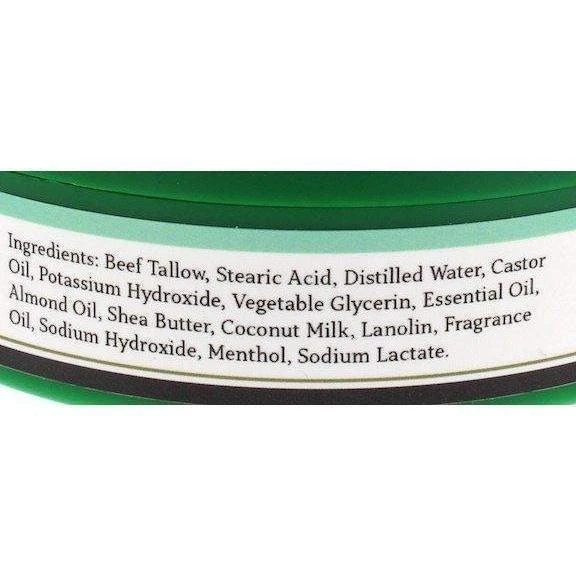 Ingredients: Beef Tallow, Stearic Acid, Distilled Water, Castor Oil, Potassium Hydroxide, Vegetable Glycerin, Essential Oil, Almond Oil, Shea Butter, Coconut Milk, Lanolin, Fragrance Oil, Sodium Hydroxide, Menthol, Sodium Lactate