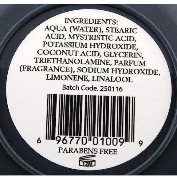 INGREDIENTS: Water, Stearic Acid, Myristic Acid, Potassium Hydroxide, Coconut Acid, Glycerin, Triethanolamine, Parfum, Sodium Hydroxide, Limonene, Linalool
