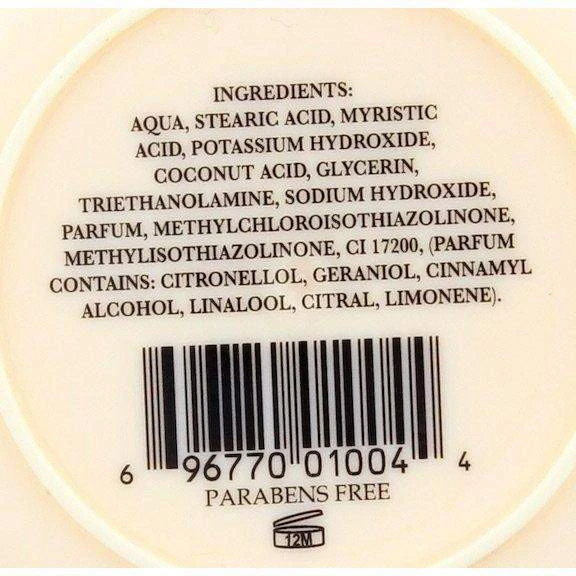 INGREDIENTS: Water, Stearic Acid, Myristic Acid, Potassium Hydroxide, Coconut Acid, Glycerin, Triethanolamine, Sodium Hydroxide, Parfum, Methylchloroisothiazolinone, Methylsisothiazolinone, CI 17200, (Parfum contains: Citronellol, Geraniol, Cinnamyl Alcohol, Linalool, Citral, Limonene)