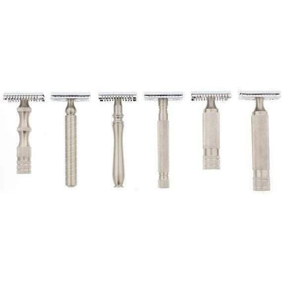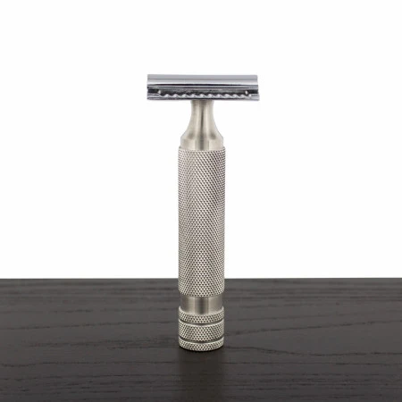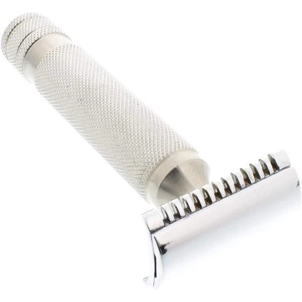 This textured handle is constructed with solid 303 stainless steel so it is long-lasting, corrosion-resistant, and gleaming. This grooming utensil is heavy duty with a large diameter, extra length, and hefty knurling. Perfect for a large man’s hand. The heads are zinc-alloy with chrome-plating. This razor comes with a closed comb head. (The handle is compatible with most standard 3-piece, DE safety razors).