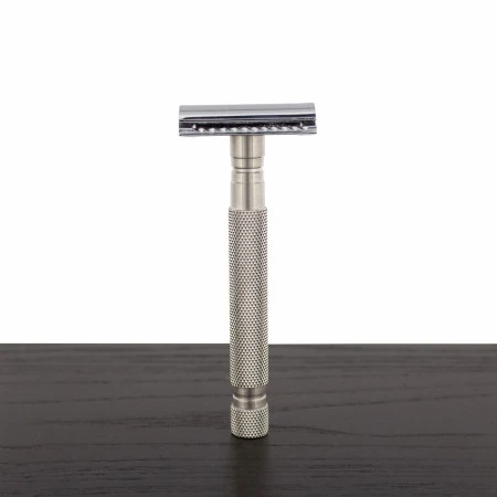 This textured handle is constructed with solid 303 stainless steel so it is long-lasting, corrosion-resistant, and gleaming. This is a slender grooming requisite. The handle diameter isn’t a large as some but it has extra length. The perfect tool for longer strokes- head shavers and woman shavers might really like this possibility. It has a nice knurling pattern for excellent grip in wet environments. The heads are zinc-alloy with chrome-plating. This razor comes with a closed comb head. (The handle is compatible with most standard 3-piece, DE safety razors).