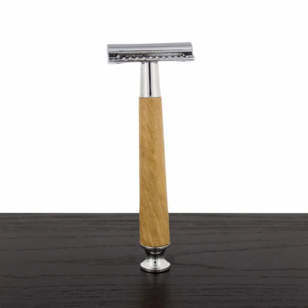 This handle is constructed of Koa wood and finished so it is long-lasting, water-resistant, and lovely. Koa wood is native to Hawaii and in its long history has been used for eating utensils, weapons, and canoes. It known for its rich, deep colors and varied grain patterns. Our razor has a medium tone. It is smooth and feels good in the hand. The chrome-plated hood and end cap add a little glisten to the utensil. The heads are zinc-alloy with chrome-plating. This razor comes with a closed or open comb head. (The handle is compatible with most standard 3-piece, DE safety razors).