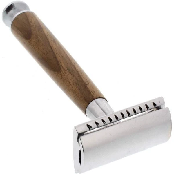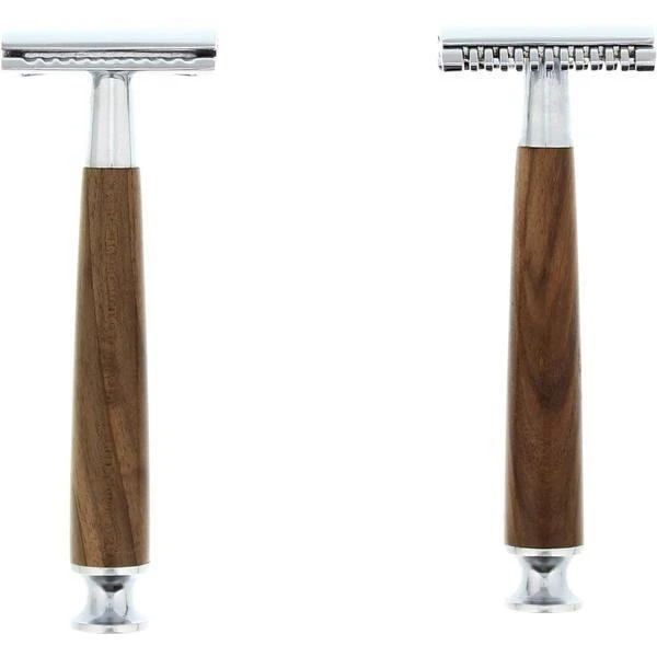 This handle is constructed of walnut wood and finished so it is long-lasting, water-resistant, and lovely. Walnut wood is known for its strength, stability, and color. While the color can vary greatly depending on where from the tree it is harvested, our handle is a dark, tight-grained option. It is smooth and feels good in the hand. The chrome-plated hood and end cap add a little glisten to the utensil. The heads are zinc-alloy with chrome-plating. This razor comes with a closed or open comb head. (The handle is compatible with most standard 3-piece, DE safety razors).