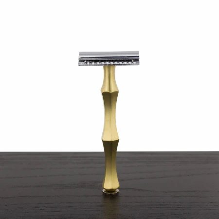 The elegant handle is constructed with brass so it is long-lasting, corrosion-resistant, and gleaming. The handle is lightweight and unique, using angles and lines instead of the typical curves of most handles. The warm brass gives it a nostalgic feel. The heads are zinc-alloy with chrome-plating. Choose an open or closed comb head from the drop-down menu. (The handle is compatible with most standard 3-piece, DE safety razors).
